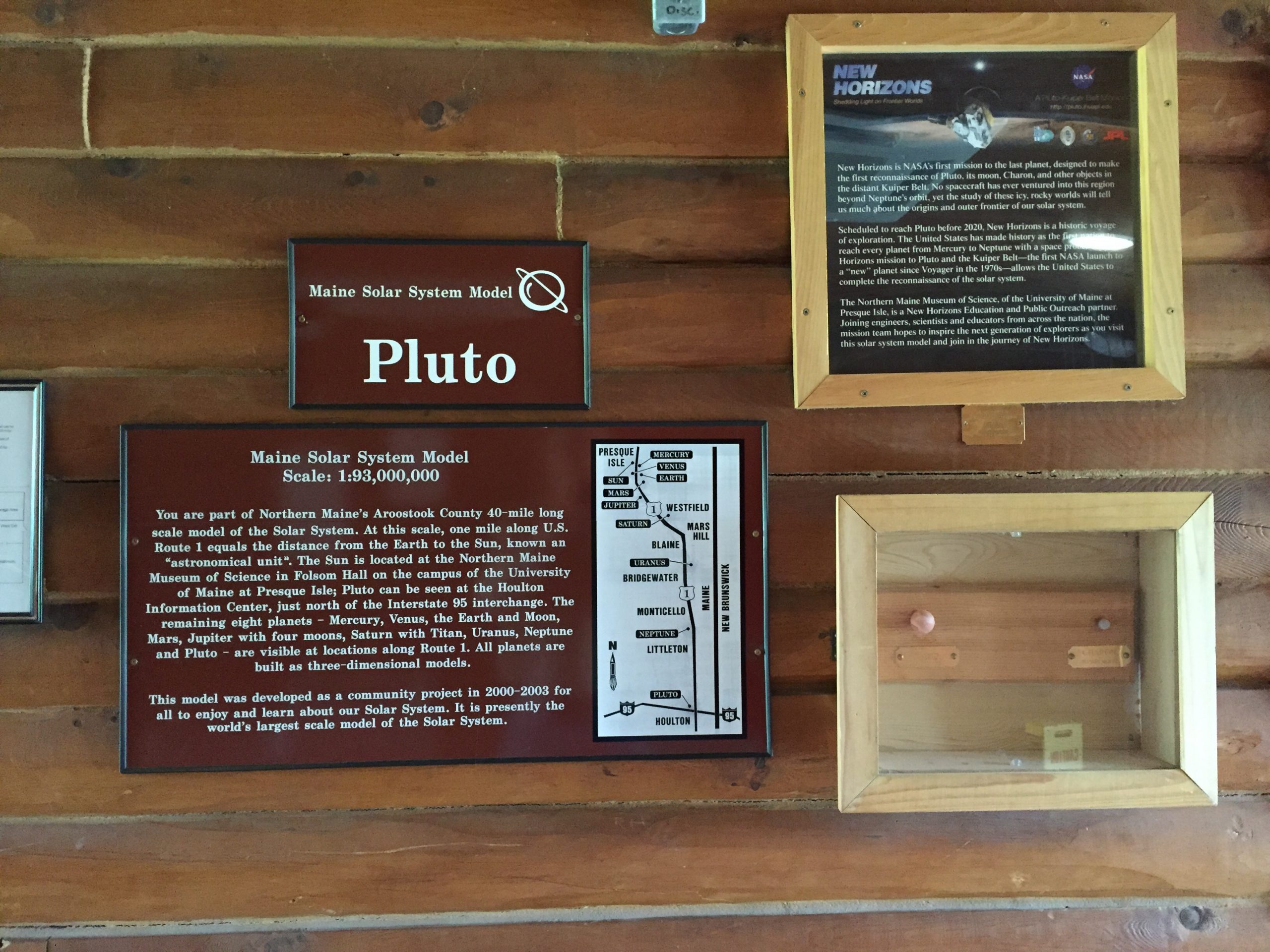 The model originally stretched from the campus in Presque Isle all the way to Houlton, 43 miles south. Pluto is at the Maine Visitors Center in Houlton, near where we’re camped. After Eris was discovered, they added that 45 miles south of Houlton. Maybe they’ll find something really far out some day, so they have to add a model in Florida!