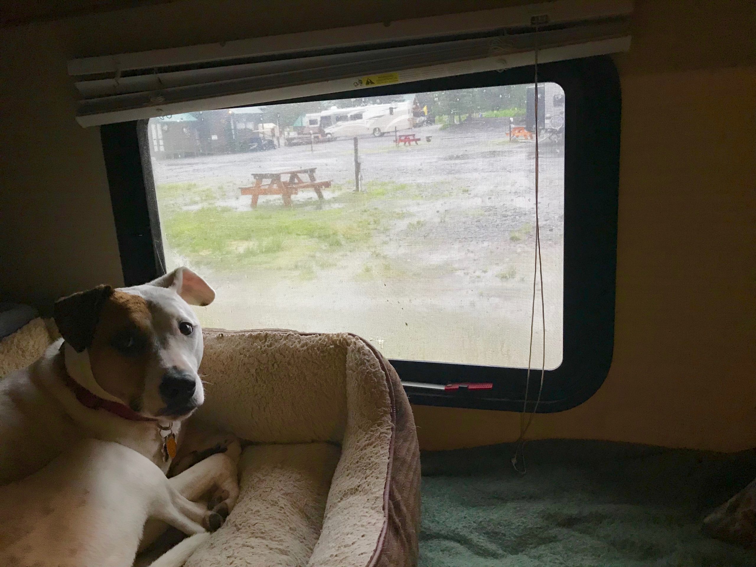 Before we went to Canada, though, Tom found a couple more places to explore. He found a nice campground by a lake where we could stay a few days. There were moose around the lake! Moose are big and scary, but I’m getting used to them.
